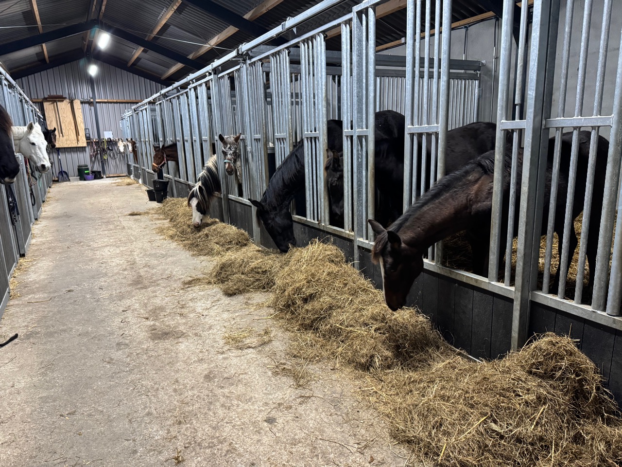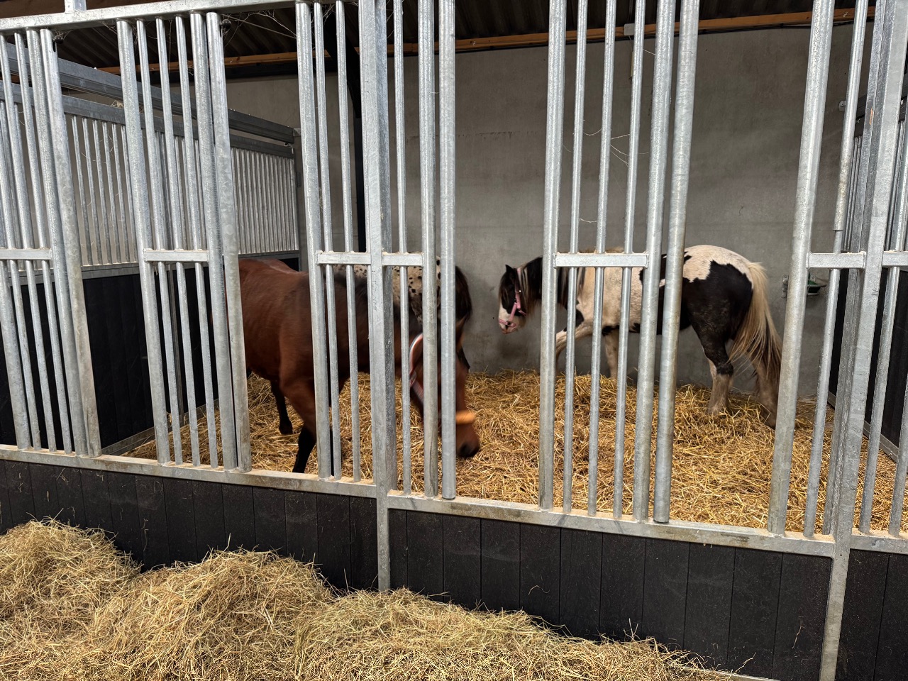 In groepjes van 3 staan ze in ruime stallen met onbeperkt ruwvoer.